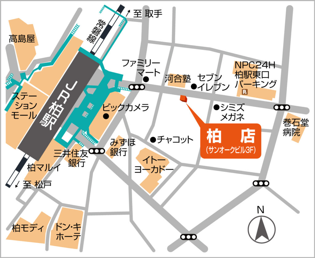 お客様に無理なく通っていただけるように、柏駅から徒歩3分以内にお店があります。お客様が来店する事に少しでもストレスを感じずに来てもらえるように「近くて便利」を追究しております。