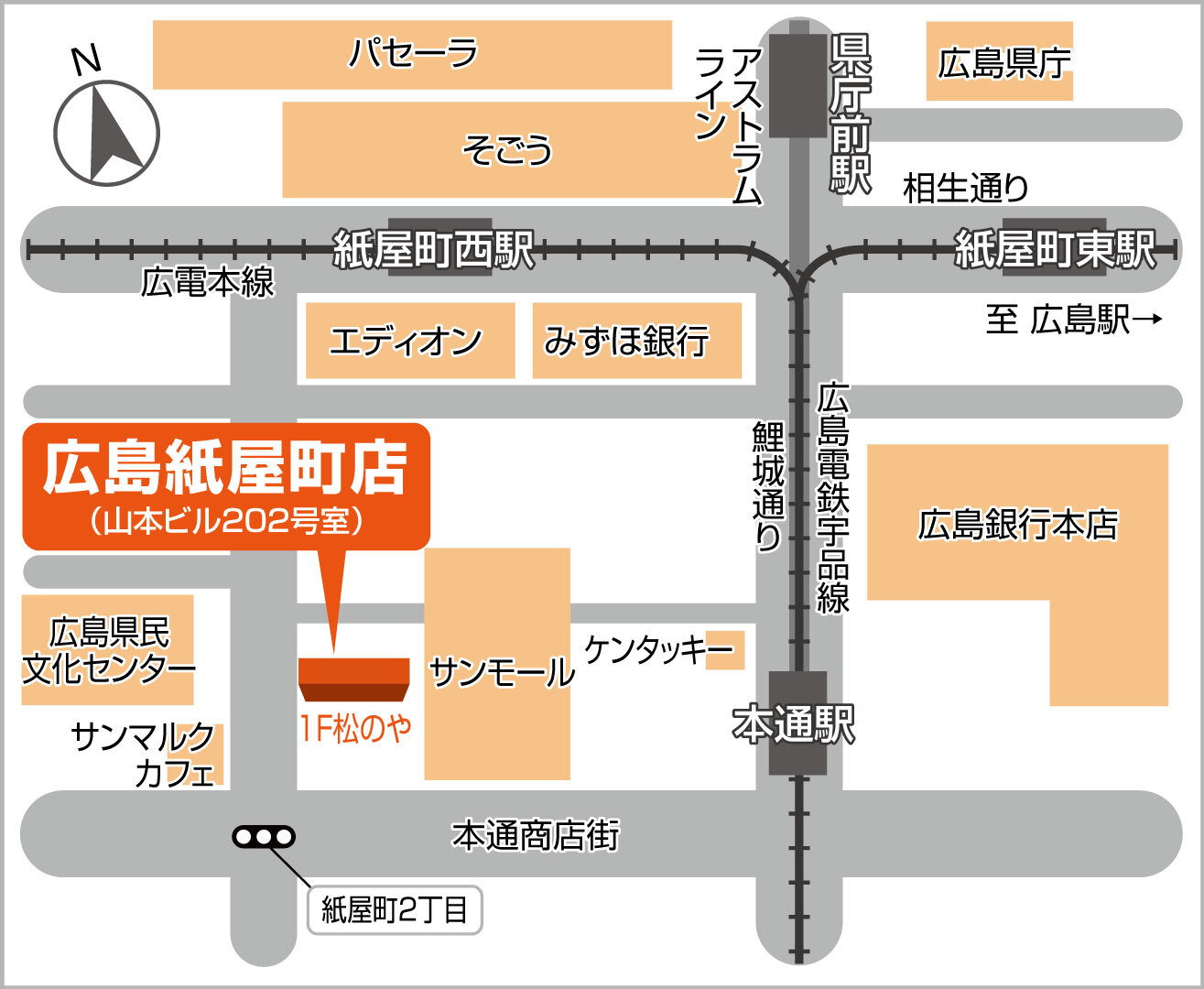 お客様に無理なく通っていただけるように、紙屋町西駅から徒歩3分以内の場所にお店があります。