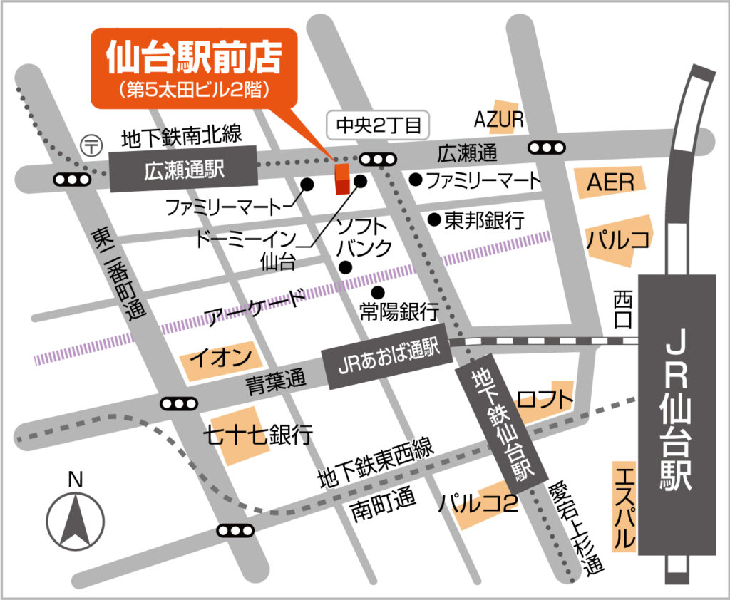 お客様に無理なく通っていただけるように、仙台駅から徒歩5分以内にお店があります。お客様が来店する事に少しでもストレスを感じずに来てもらえるように「近くて便利」を追究しております。