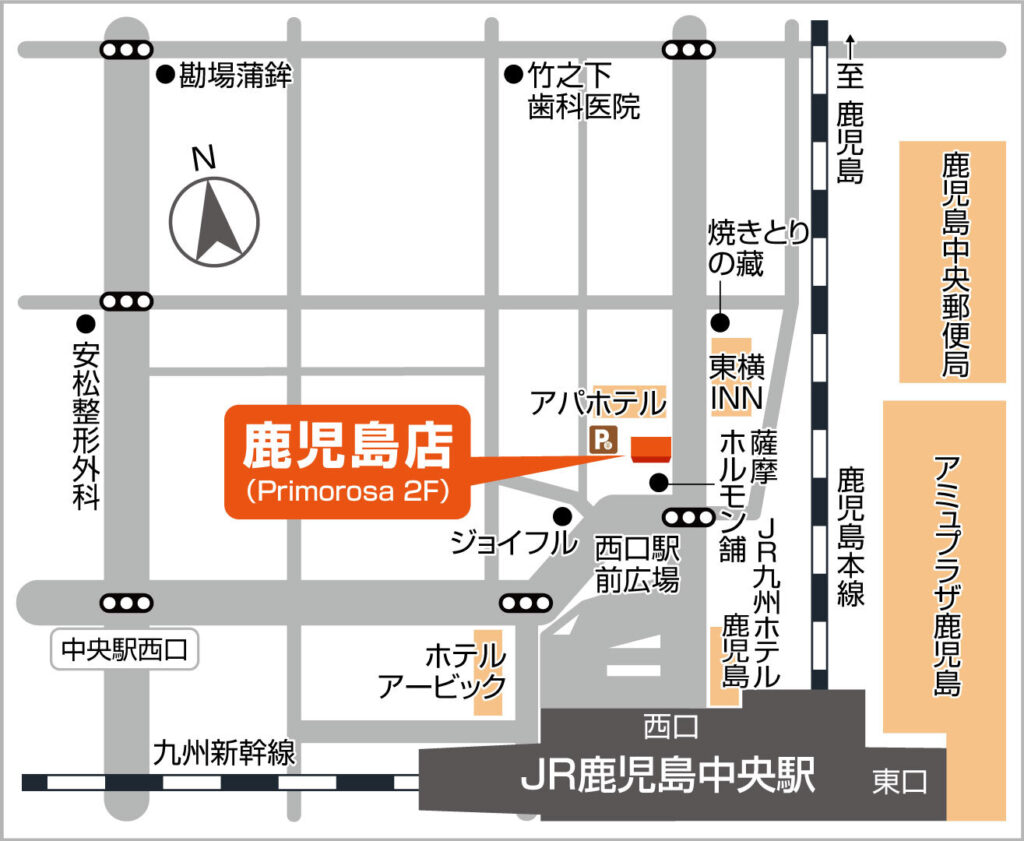 お客様に無理なく通っていただけるように、鹿児島県のメイン駅から徒歩2分以内の場所にお店があります。お客様が来店する事に少しでもストレスを感じずに来てもらえるように「近くて便利」を追究しております。